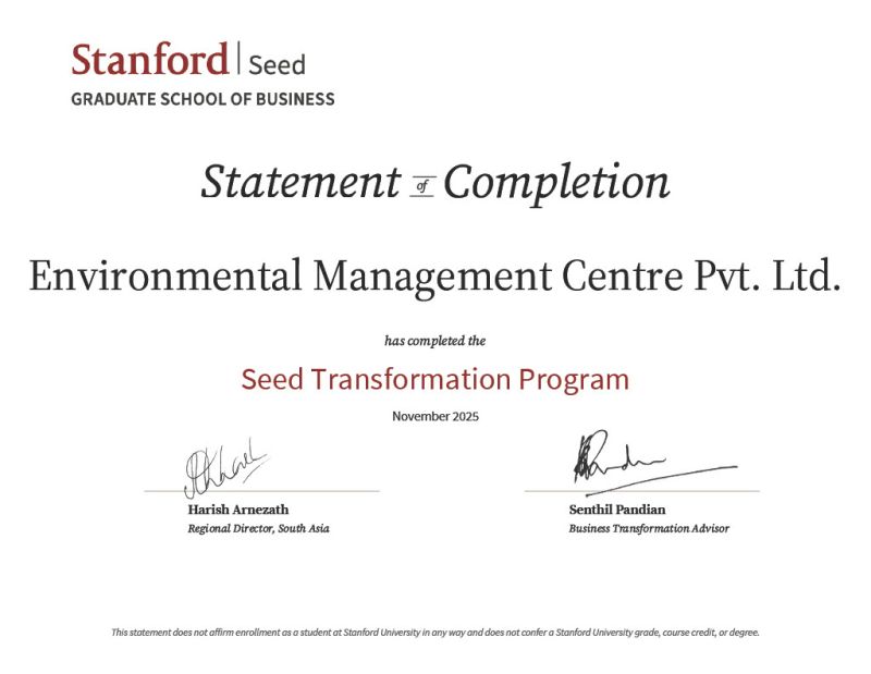 Environmental Management Centre Pvt. Ltd. (EMC) has successfully completed the Stanford Seed Transformation Program (https://www.gsb.stanford.edu/faculty-research/seed/transformation-program) in November 2025. This milestone marks the completion of an intensive 10-month engagement aimed at strengthening strategic direction, operational discipline, and long-term growth.